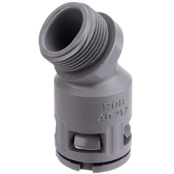 The Flexa RQB1-45-M 15101042040 (Old Part Number 5101.010.040) is described as a plastic 45° elbow conduit connector with metric M40 x 1.5 outer thread. It features the Flexaquick quick connect system with an integrated snap-in and release sleeve and conical sealing.