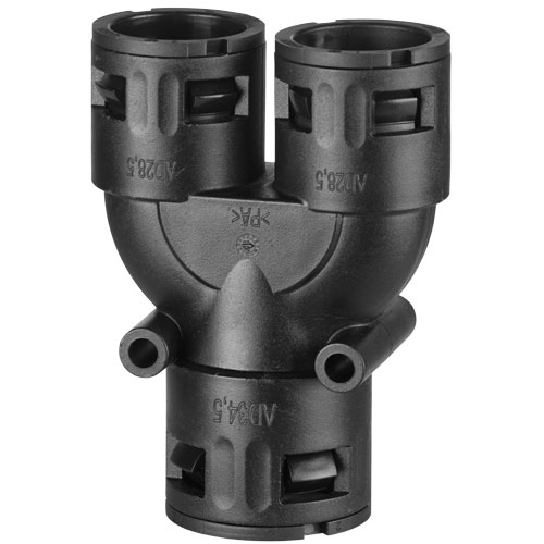 The Flexaquick RQY-PA 15020032206 (Old Part Number 5020.032.206) is a 21.2 / 2 x 15.8 mm OD Black plastic “Y” fitting for corrugated conduits.
